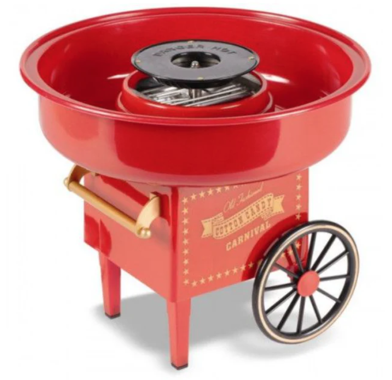 Aparatul de făcut vată de zahăr, model retro stil cărucior, îți aduce magia târgurilor de altădată în confortul propriei case. Cu un design clasic, acest aparat nu doar că transformă zahărul simplu în vată pufoasă și delicioasă, ci și îmbogățește atmosfera oricărei petreceri sau eveniment special. În câteva minute, poți recrea amintirile copilăriei, adăugând arome și culori preferate pentru a personaliza fiecare porție de vată de zahăr.