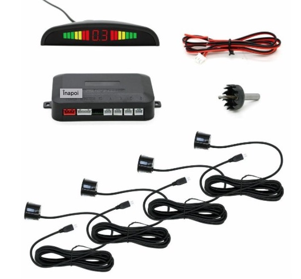 - Display LED intuitiv: Afișajul digital cu lumini colorate indică distanța față de obstacole, facilitând manevrele de parcare.