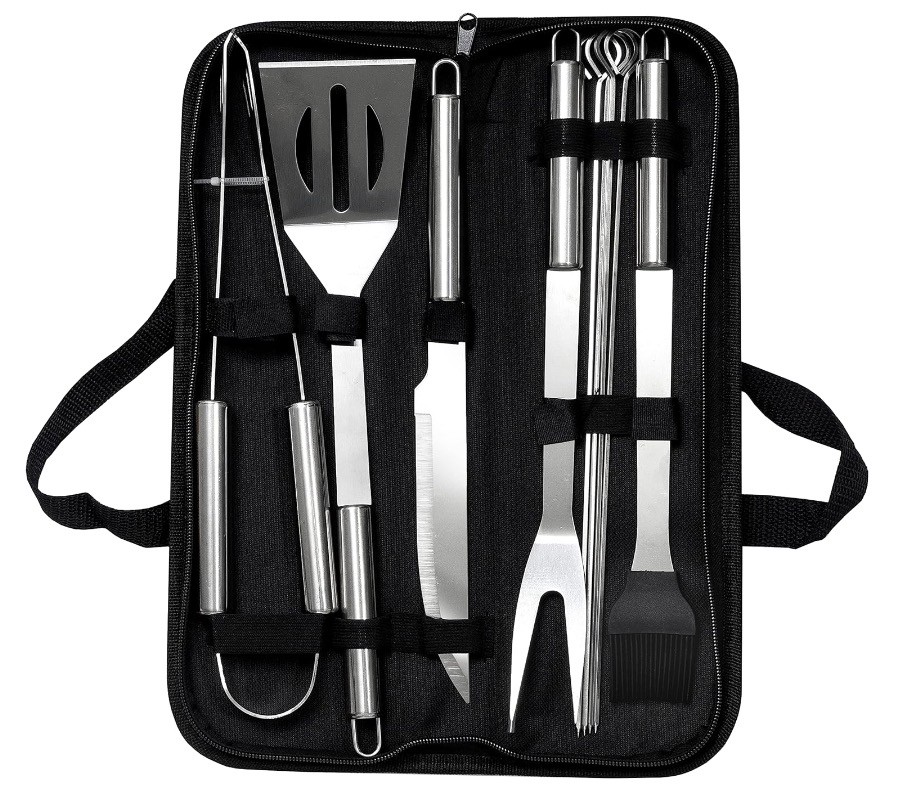 - Set complet: Include clește, furculiță, lopată, cuțit, perie și 5 frigărui din oțel inoxidabil.