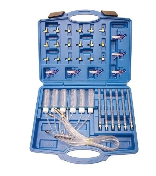 Trusa de 36 de piese pentru tester presiune injectoare este soluția ideală pentru diagnosticarea rapidă și eficientă a injectoarelor motoarelor diesel cu până la 6 cilindri. Acest kit cuprinde 6 eprubete, 24 de adaptoare și 6 recipiente cu tub, facilitând astfel măsurarea precisă a cantității de combustibil evacuat la preaplinul injectorului. Cu ajutorul acestui aparat, puteți identifica cu ușurință problemele precum deteriorarea, murdăria sau scurgerile din injectoare.